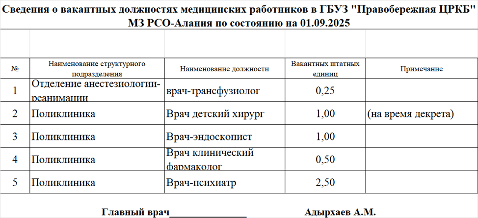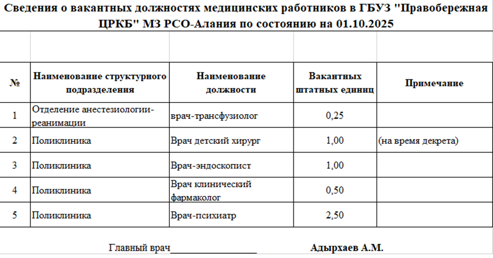 Вакансии ГБУЗ "Правобережная центральная районная клиническая больница" (ПЦРКБ) МЗ РСО-Алания размещаются на сайте Министерства здравоохранения Республики Северная Осетия-Алания